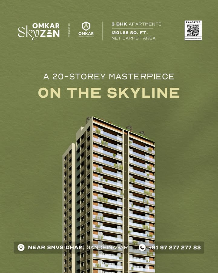 A home that rises above the chaos and settles into calm Omkar Skyzen designed for balance and calm Near SMVS Dham Gandhinagar 91 9898 343 342
