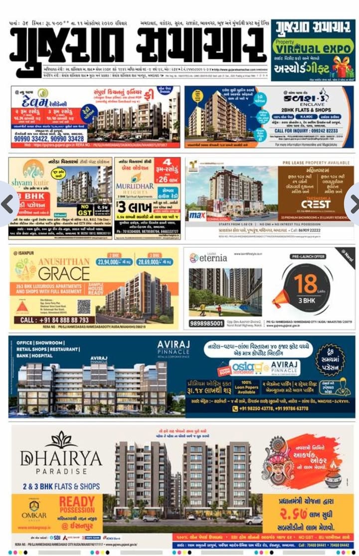 Divya Bhaskar's Front Page advertisement: OMKAR-2 @ Narol. Get Modular kitchen free with your new home. Sample Flat is ready. Contact:-..