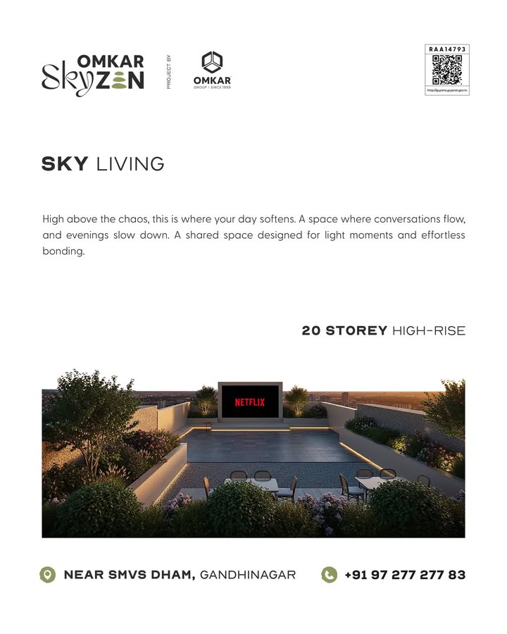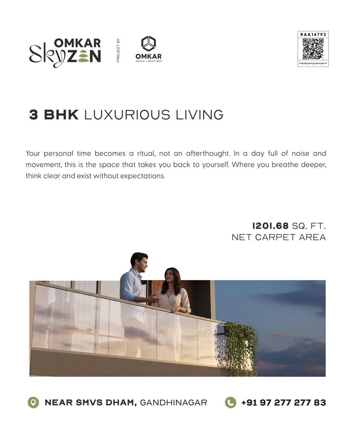 Spaces at Omkar Skyzen that encourage you to pause connect and unwind and bring balance to modern living Luxurious 3 BHK apartments Near SMVS Dham Gandhinagar 91 9898 343 342