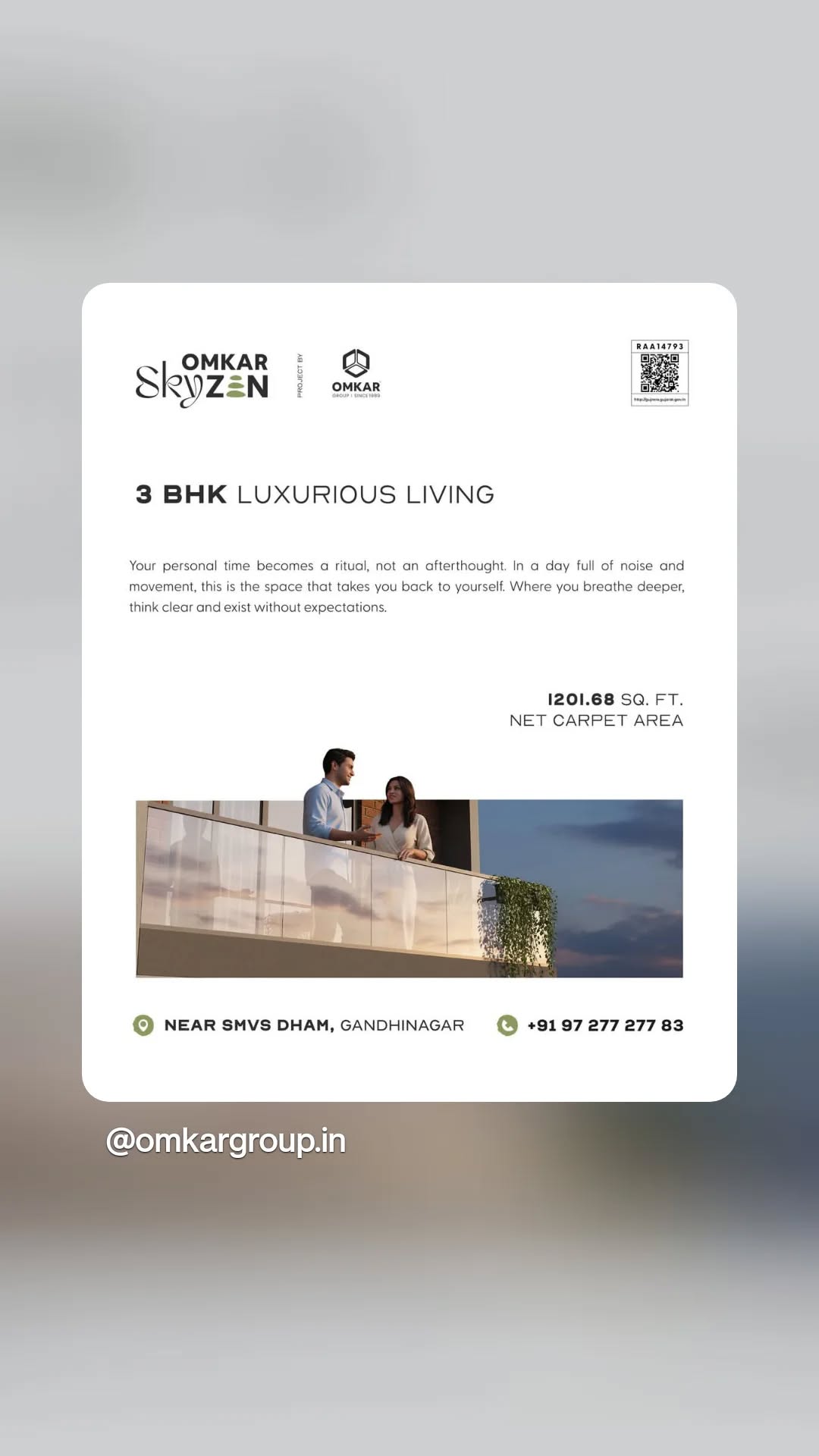 Your balcony becomes a pause between the world outside and the peace within Crafted for your personal time at Omkar Skyzen Luxurious 3 BHK apartments Near SMVS Dham Gandhinagar 91 9898 343 342