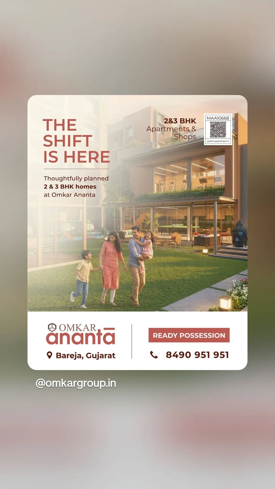 Your shift in lifestyle is here at Omkar Ananta Modern homes amenities and a location closer to the city bring you everything that truly matters Possession ready Visit now Bareja Ahmedabad 91 8490 951 951